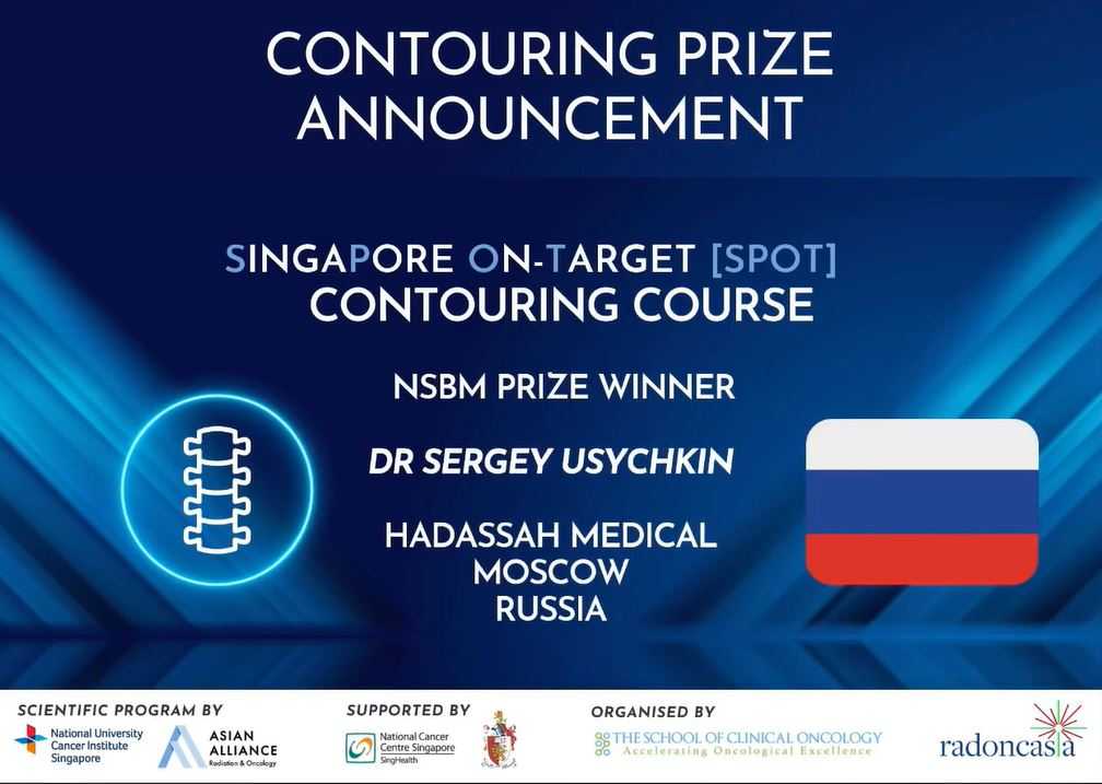 Сергей Усычкин победил в конкурсе по оконтуриванию мишеней облучения в направлении «Костные метастазы вне позвоночника» (Non-spine Bone Metastases). Его контуры в наибольшей степени соответствовали контурам профессора Эрика Ценга из Sunnybrook Health Sciences Centre (Университет Торонто). Следует отметить, что в прошлом году на этом конкурсе Сергей Усычкин выиграл номинацию по лучшему оконтуриванию при раке поджелудочной железы.